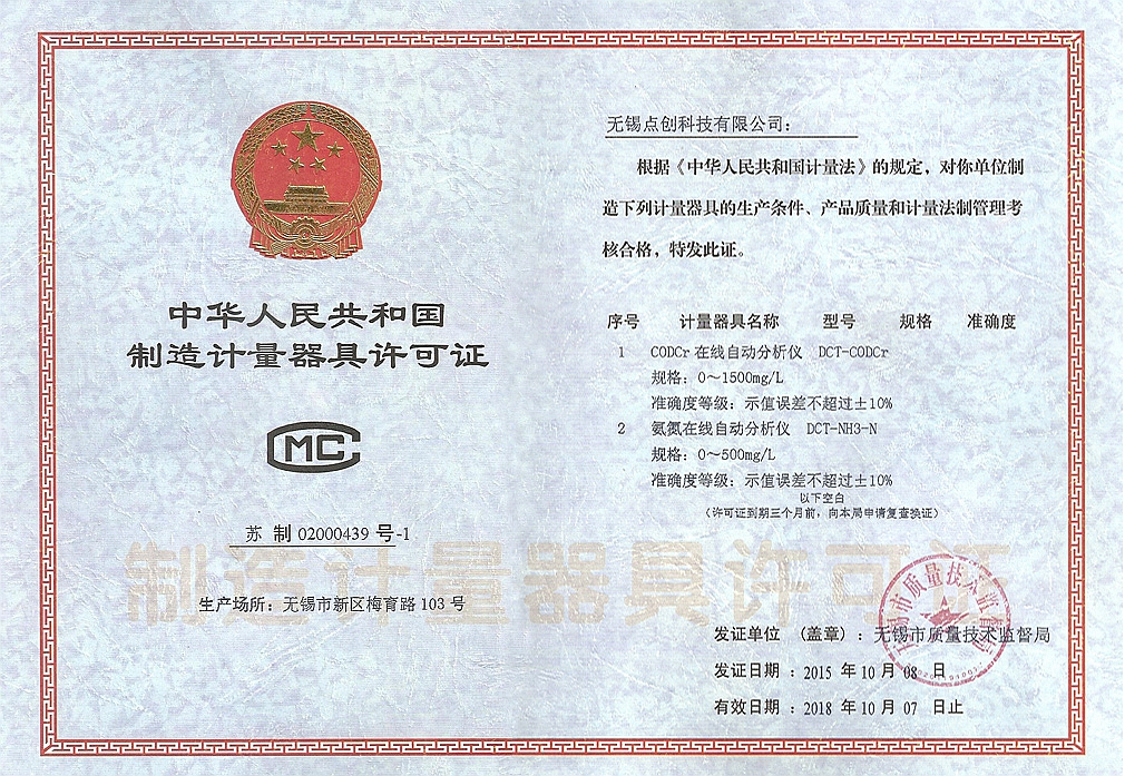 無錫點創科技有限公司,在2015年10月,由無錫市質量技術監督局對工廠生產條件、產品質量和計量管理,認定合格,頒發了《中華人民共和國制造計量器具許可證》。2017年2月20日獲得中國環境保護產業協會頒發的《中國環境保護產品認證證書》,主要針對CODcr水質自動在線分析儀系列產品的技術品質認定以及市場準入、許可。